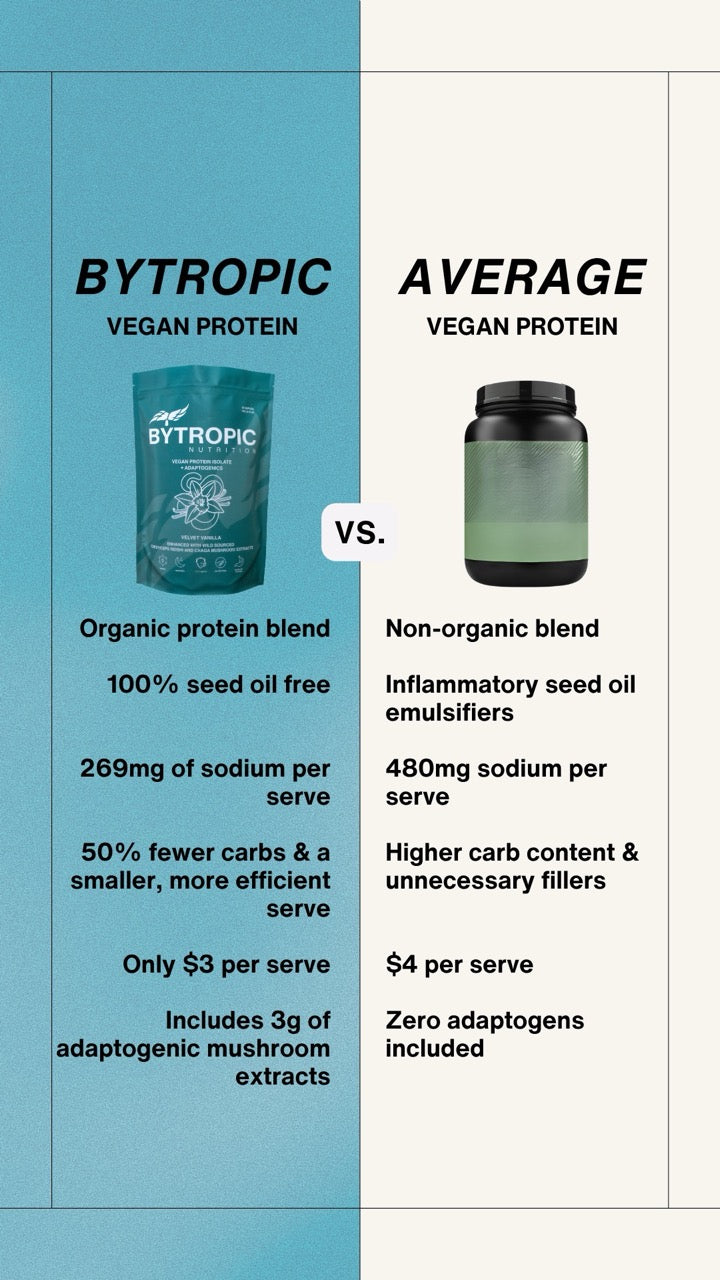 Bytropic’s Velvet Vanilla Plant-Based Protein delivers smooth, creamy nourishment enriched with wild-sourced Chaga, Reishi, and Cordyceps mushroom extracts—crafted to support recovery, performance, and everyday balance.